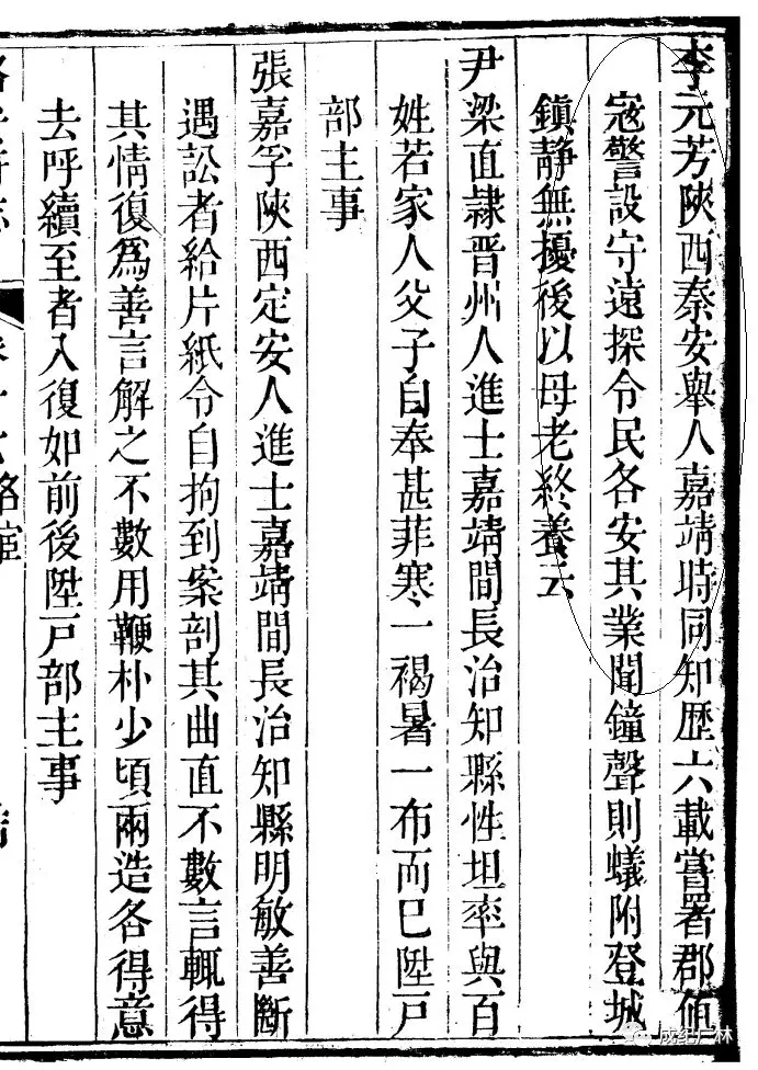 李元芳,陕西秦安举人,嘉靖时同知。历六载,尝署郡,值寇警,设守远探,令民各安其业。闻钟声则蚁附登城,镇静无扰。后以母老终养云。