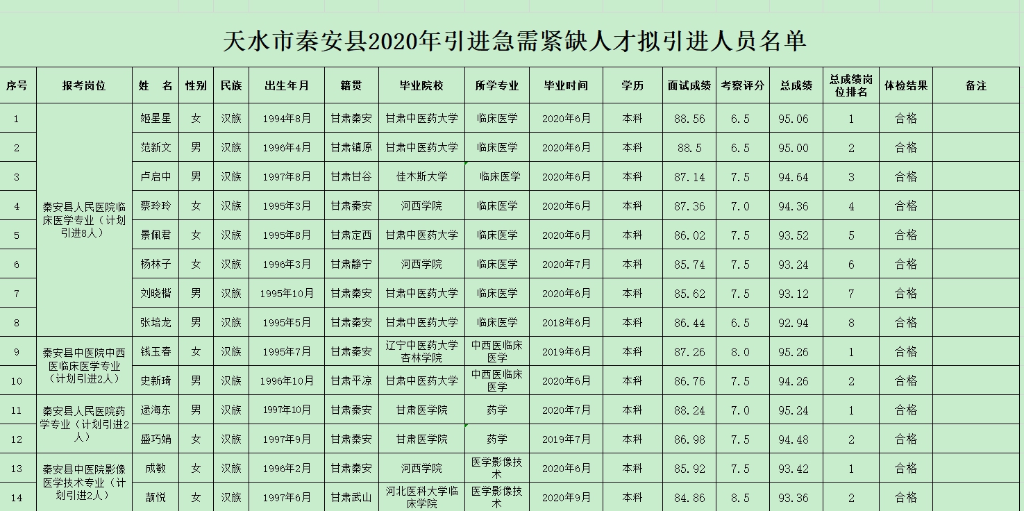 根据《天水市2020年引进345名急需紧缺人才公告》,姬星星等14名经过网上报名、资格复审、面试、考察、体检等程序,被确定为拟引进人员,现予以公示,欢迎社会各界监督。如发现有影响引进的问题,请在公示期内通过电话、来信、面谈等形式反映,我们将认真受理,并进行调查核实。经查证属实,将按照规定取消相关人员聘用资格,空缺名额按照综合成绩从高到低依次递补,递补只进行一次。公示期间无异议,或虽有异议经查证不影响引进的,按程序办理引进手续。