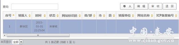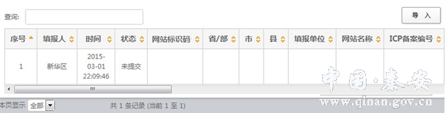 组织单位在收到上报文件后,使用账号和密码登录报送系统,在“政府网站和栏目(系统)基本信息表”的数据管理页面中,将上报文件导入系统。