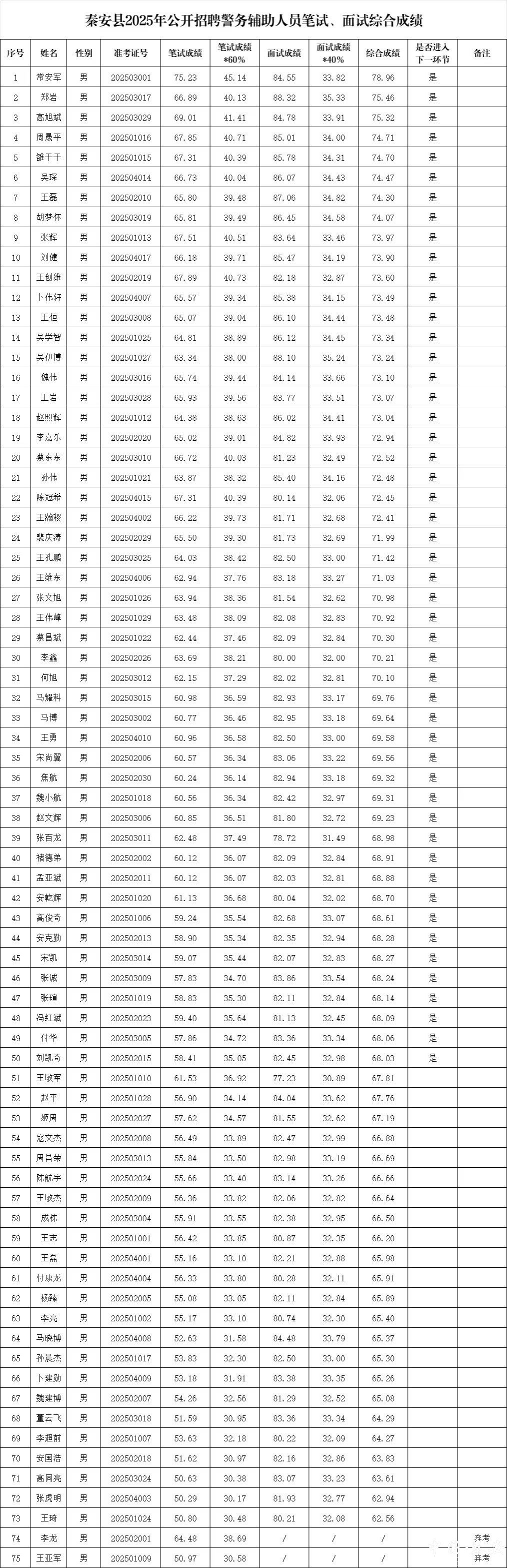 附件1: 秦安县2025年公开招聘警务辅助人员笔试面试综合成绩