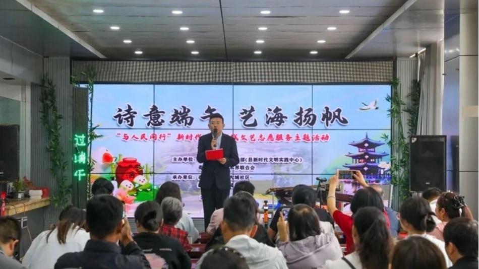 艾草飘香传雅韵,文艺惠民润民心。5月27日,由中共甘肃省秦安县委宣传部(县新时代文明实践中心)、县文学艺术界联合会主办的“诗意端午·艺海扬帆”——“与人民同行”新时代文明实践文艺志愿服务活动在兴国镇大城社区举行。来自全县的文艺志愿者与150余名社区居民共聚一堂,通过诗词朗诵、非遗展演、民俗体验等形式,共庆端午佳节,传承传统文化。