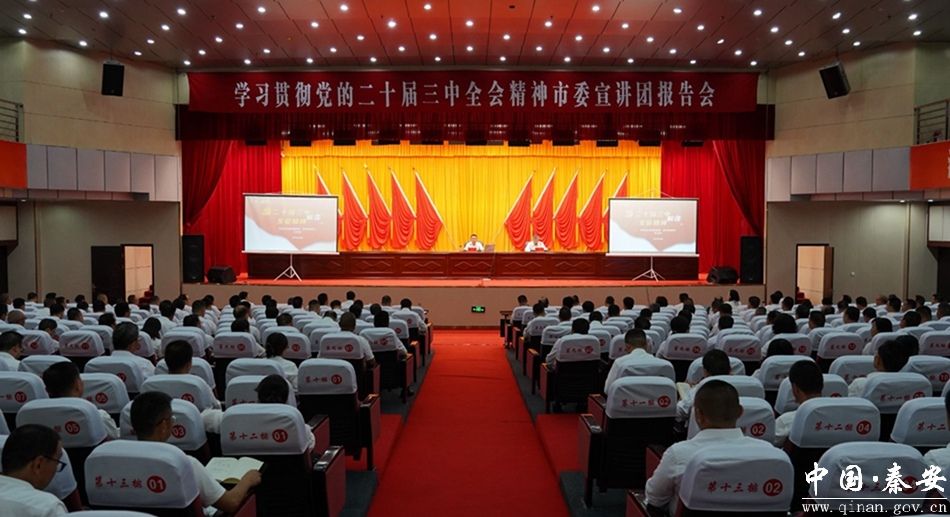 8月21日,学习贯彻党的二十届三中全会精神市委宣讲团报告会在秦安县举行,市委常委、宣传部部长王文东作宣讲报告。县委书记周济主持报告会。县四大组织全体领导,法检“两长”,副县级干部及各镇、县直各部门主要和分管负责人,有关科级干部及科技人才,党代会基层代表和党校教师共计220余人参加报告会。