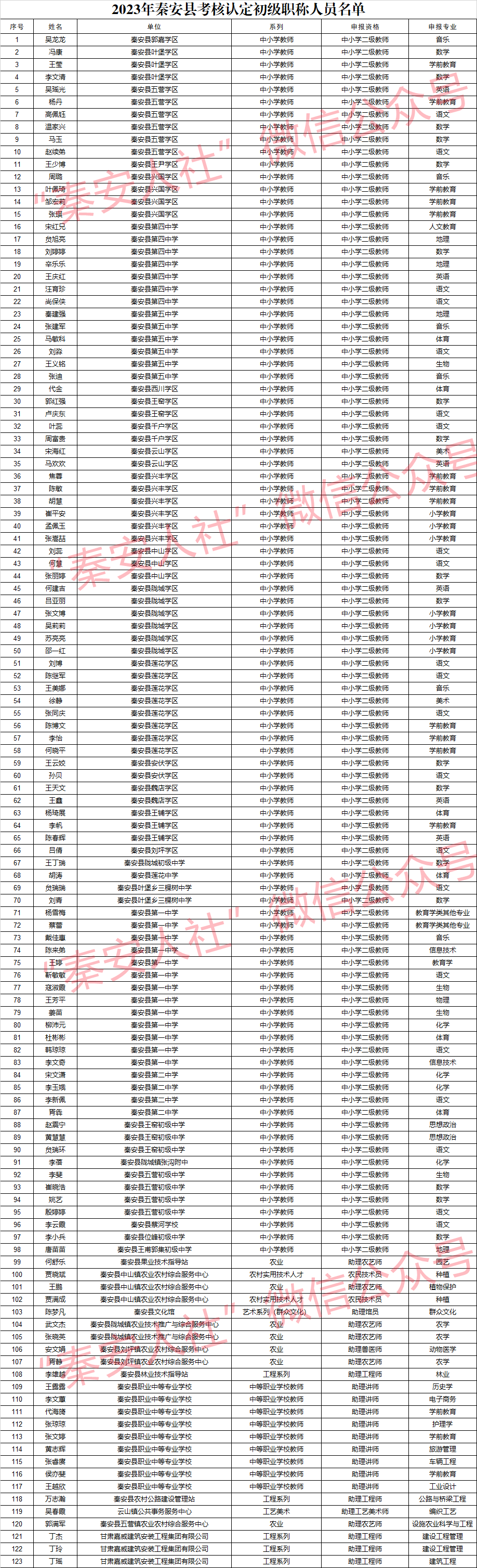 根据《天水市人力资源和社会保障局关于做好我市初级职称考核认定的通知》(天人社发〔2018〕538号)精神,经个人申报、单位考核公示、主管部门审查、县人力资源和社会保障局审核认定,吴龙龙等123名同志具备初级职称任职资格条件,现予以公示,欢迎社会各界监督。如发现有影响考核认定的问题,请在公示期内通过电话、来信、面谈等形式反映,我们将认真受理,并进行调查核实。经查证属实,将按照规定取消相关人员考核认定资格。公示期间无异议,或虽有异议经查证不影响认定的,按程序进行下一个环节的工作。